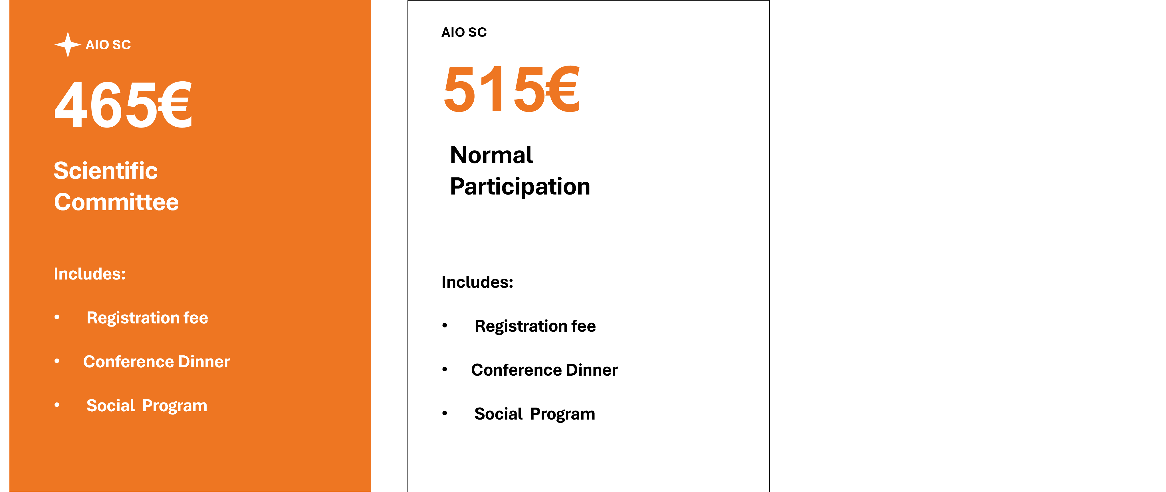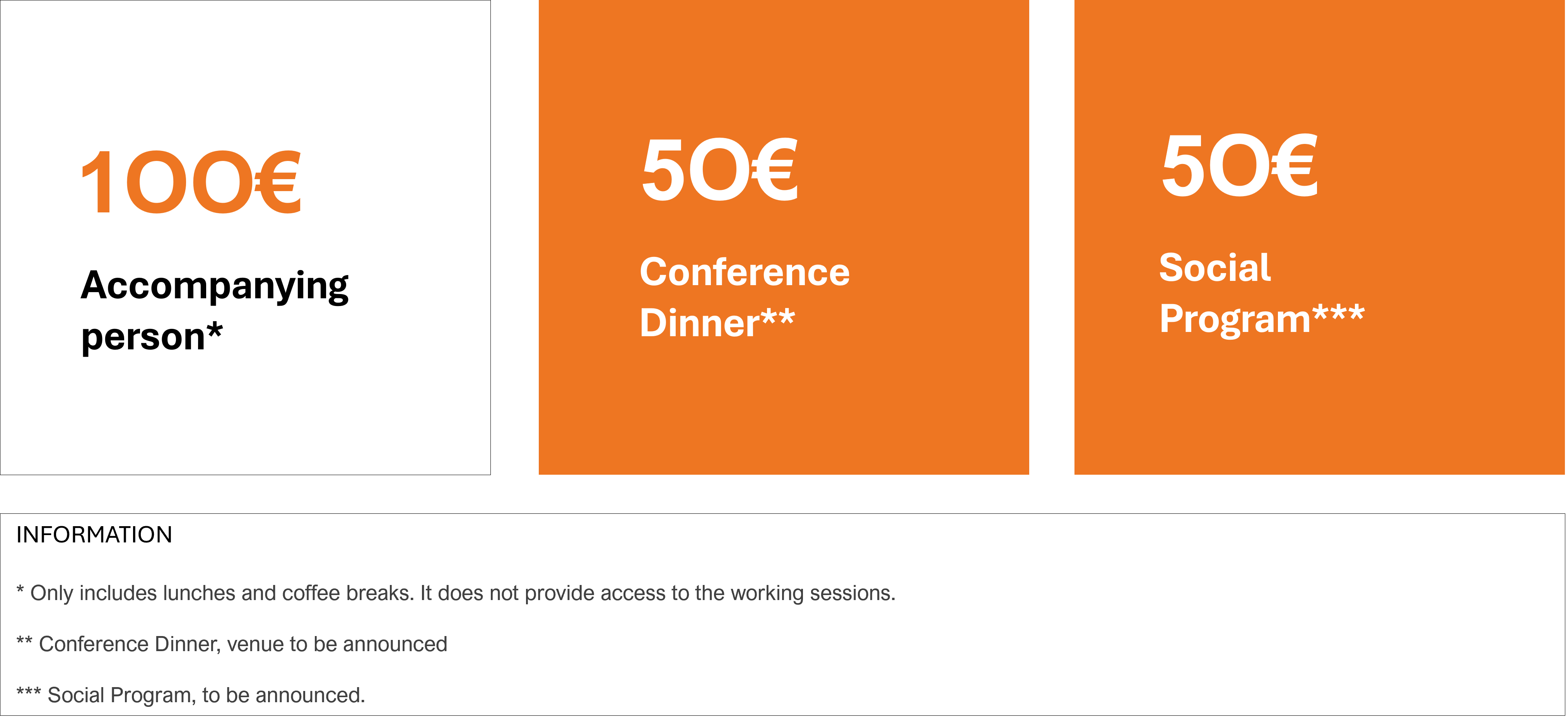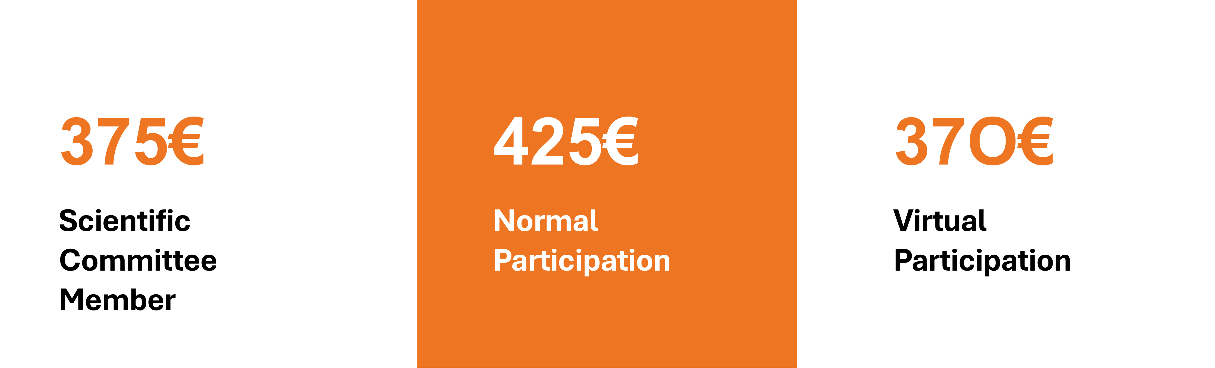 The registration fee includes lunch on working days of the conference, coffee breaks and documentation (proceedings in digital format, etc.), except for Virtual Participation. However, it does not include accommodation or transportation. The conference dinner, accompanying person and social program are optional items.